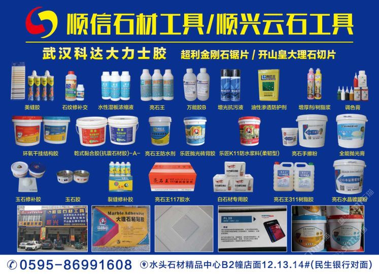 南安市順信石材工具有限公司成立于1999年,位于有“中國石材城”之稱的福建省南安市水頭鎮(zhèn)閩南建材市場內(nèi),分設(shè)石材工具護(hù)理部、干掛部兩個門市部,是一家批發(fā)、零售兼營的石材配套工具。多年來,憑借產(chǎn)品的齊全、質(zhì)量的保證、信譽(yù)的可靠、服務(wù)的周到,本商行在國內(nèi)同行中已形成自己的地位和影響,并擁有龐大的客戶群體,產(chǎn)品銷至國內(nèi)各大石材生產(chǎn)基地。我們代理的品牌有:武漢科達(dá)大力士膠、環(huán)氧膠、化學(xué)錨栓、干掛膠、植筋膠等產(chǎn)品系列;亮石王防護(hù)劑、防古水、水晶膠、樹脂膠、友豐比利蠟等產(chǎn)品;粵邦消紋劑、染色劑、百亮鋼絲棉、百潔墊;旗魚、非爾、柏興、順輝、背栓螺絲;各種款式干掛件、幕墻材料輔助產(chǎn)品;磨料磨具品牌有益和、超利、順興、閩福、芒果、金山、金鋒、智輝等;進(jìn)口、國產(chǎn)防古刷、亞光磨料、大理石磨料;意大利開山皇大理石刀具、微晶石刀具、電鍍切片、超利金鋼石切割片、軟磨片、翻新片、金鋼盤、樹脂盤;大小規(guī)格刀具、鉆頭、雕刻工具齊全;金鋼石異形輪、石材夾具、吊具、吊繩、勞保用品;電動工具、氣動工具、銅條、鋼條、合金工具等各種各樣產(chǎn)品齊全。