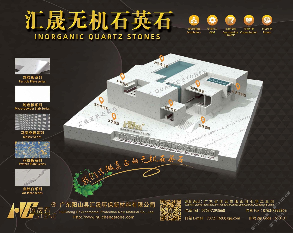 廣東陽山縣匯晟環(huán)保新材料有限公司位于廣東省清遠市陽山縣七拱工業(yè)園,是一家專注于研發(fā)、生產(chǎn)及銷售無機型人造石裝飾板材的企業(yè)。 我司配備有技術研發(fā)人員、建筑師、室內(nèi)設計師、景觀設計師組成的顧問團隊,不僅具有雄厚的產(chǎn)品開發(fā)實力,為建筑物室外及室內(nèi)裝飾建材的應用提供優(yōu)秀的需求解決方案,還能為客戶提供更為優(yōu)質(zhì)的專屬定制服務。 “匯晟石”產(chǎn)品配方和PLC控制自動化生產(chǎn)線均為我司自有和自主研制的成熟技術,年產(chǎn)能力為60萬平方米。不含樹脂的無機石英石裝飾板材是我司專門研發(fā)生產(chǎn)的主打產(chǎn)品。它有別于市面上一般的無機型人造石、水磨石和樹脂型人造石,區(qū)別在“匯晟石”采用莫氏硬度為7度的石英砂作骨料,配以無機粘接劑及無機顏料,以單片壓制技術制作,通過真空至密高頻震動技術壓制成型,生產(chǎn)過程不添加樹脂粘合劑,為綠色環(huán)保的建材產(chǎn)品。 我司首創(chuàng)獨特的無機人造石自然紋路實現(xiàn)了量產(chǎn)技術;產(chǎn)品添加防泛堿因子,長期發(fā)揮防泛堿作用。產(chǎn)品特點具有高硬度、不易彎折、不易磨損、低吸水率(僅0.2%)、可承受高溫、耐侯性好、便于清潔與保養(yǎng)、健康無輻射等,為建筑物的室外、室內(nèi)提供全方位應用,在后加工、維護環(huán)節(jié)更能節(jié)省費用。 “匯晟石”分為細、粗顆粒大板、花紋大板、純色微晶大板、魚肚白&線紋大板、無縫馬賽克大板共五大系列板材。產(chǎn)品規(guī)格為長3230×寬1630mm、長3030×寬1530mm、長1620×寬800mm、長1520×寬750mm;板材厚度可選:15mm,18mm,20mm,25mm,30mm。產(chǎn)品檢驗報告的各項理化性能指標均高于相關國家標準和行業(yè)標準。 目前,無機人造石已廣泛應用于商業(yè)建筑、地鐵公用空間、別墅、樓盤、辦公樓、學校、酒店、銀行、醫(yī)院、候機樓、會展中心等場所。產(chǎn)品運用在室外、室內(nèi)、墻身、地面、窗臺、浴室柜、櫥柜、水臺、吧臺、餐臺、茶幾、柜面、園林墻景、水景、泳池等。 精石海匯,晟于匠心。我們始終堅持做價格厚道的產(chǎn)品,成為客戶信任的無機人造石供應商的企業(yè)使命,實現(xiàn)“有建筑的地方就有匯晟石材”的企業(yè)愿景,堅守“誠信、品質(zhì)、精細、創(chuàng)新、共贏、擔當”的經(jīng)營理念,與廣大客戶精誠合作,共贏未來!