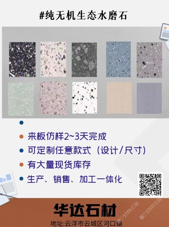 云浮市華達(dá)聚賢新型石材有限公司是一家以研發(fā)制造、加工、銷(xiāo)售新型人造石、天然石及其制品的企業(yè)。公司位于云浮市云安區(qū)石城鎮(zhèn)上洞村,占地面積30000平方米,年可生產(chǎn)人造無(wú)機(jī)石板材、自流平仿石材產(chǎn)品120萬(wàn)平方。公司擁有原材料生產(chǎn)配套基地,保證日常生產(chǎn)所需的石料、石粉,有成品加工生產(chǎn)車(chē)間,有直營(yíng)門(mén)店銷(xiāo)售,能為客戶(hù)提供從原材料選料、打樣定制、生產(chǎn)加工、工程配套等服務(wù)。華達(dá)聚賢新型石材無(wú)機(jī)水磨石、仿石材產(chǎn)品,屬于循環(huán)利用環(huán)保產(chǎn)品,所有原材料都是無(wú)機(jī)類(lèi)選材,產(chǎn)品美觀實(shí)用,耐污耐磨,防火性能好,無(wú)異味,色彩斑斕,搭配元素多樣,深受?chē)?guó)內(nèi)外設(shè)計(jì)師喜愛(ài),適用于家具、商場(chǎng)、學(xué)校、酒店、地鐵站、政府機(jī)關(guān)、企業(yè)機(jī)構(gòu)等大型公共設(shè)施室內(nèi)外鑲貼,屬新型環(huán)保建材。公司通過(guò)GB/T19001-2016idtISO9001:2015質(zhì)量管理體系認(rèn)證和GB/T24001-2016idtISO14001:2015環(huán)境管理體系認(rèn)證。