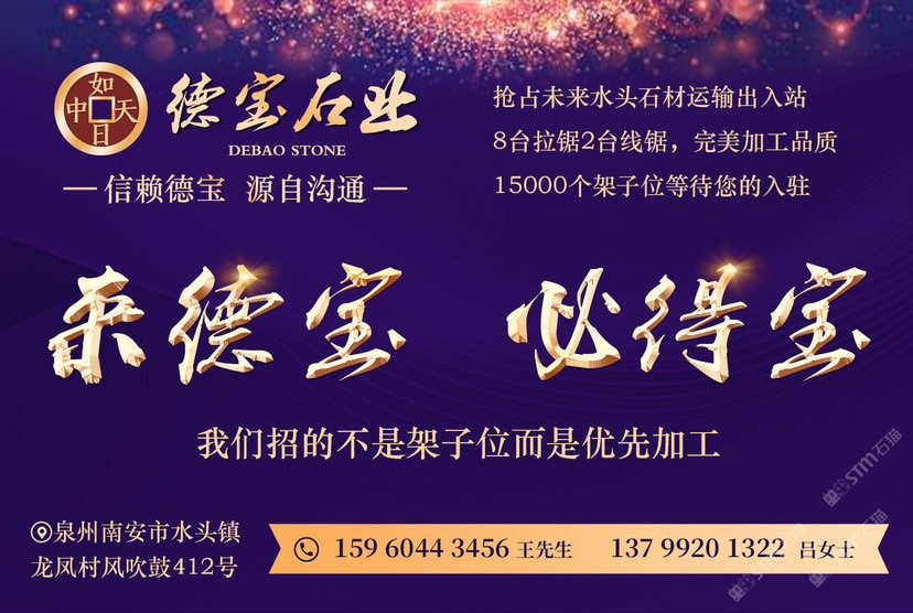 德寶大理石專業(yè)加工各規(guī)格大板,8臺(tái)拉鋸2臺(tái)線鋸,配備15000個(gè)架子位,是一家集加工、市場(chǎng)、展示為一體的二十多年老牌石企,嚴(yán)控出品質(zhì),歡迎來料加工!