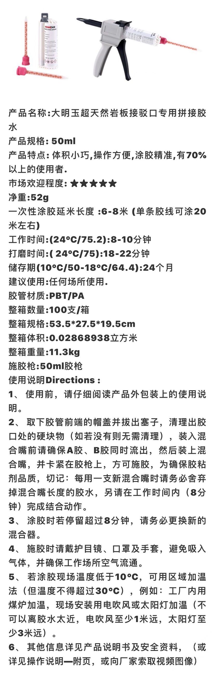 發(fā)布信息: SIBELAN斯貝納巖板專用接縫膠水 國內大廠18年專業(yè)生產巖板膠水廠家, 產品描述ProductsDescription 配套有專業(yè)膠槍。 50ml 石英石/巖板/亞克力 無縫拼接膠水 涂膠延米:4米。 250mlPE 石英石/巖板/亞克力 無縫拼接膠水 涂膠延米: 30左右米 250mlPBT石英石/巖板/亞克力 無縫拼接膠水 涂膠延米: 30左右米(實際280ml左右) 適用材質:石英石板材、巖板、天然大理石、 崗石、純亞克力板材、復合亞克力板材、 不飽和聚酯板材,。 適用顏色:差異化調色。 膠管材質:PBT。 產品優(yōu)點:高效、省時、 專業(yè)、穩(wěn)定、環(huán)保。