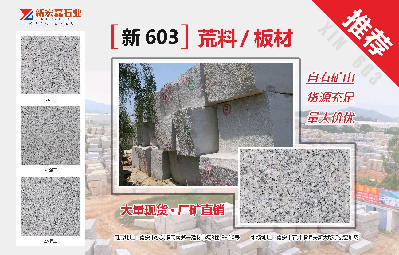 發(fā)布信息: 【新603】 荒料/板材 廠礦直銷,貨源穩(wěn)定量大價(jià)優(yōu),歡迎咨詢選購(gòu),聯(lián)系人 15005075070陳 13799979778朱