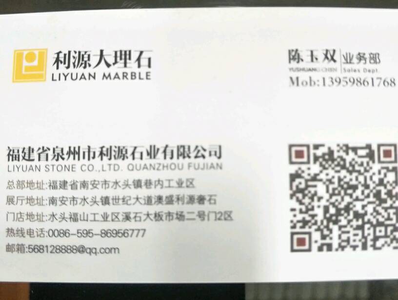 利源石業(yè) 聯(lián)系人:陳    189****0177 查看 189****0177 查看 主營范圍: 大板批發(fā)、大理石加工、礦山、 企業(yè)地址:福建泉州南安市溪石大板市場2通道2區(qū)