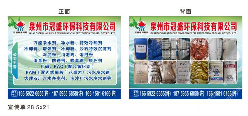 發(fā)布信息: 冠盛環(huán)保科技18759556858 主營產(chǎn)品:凈水劑,冷卻劑,冷卻粉,大理石人造石專用凈水劑,沉淀粉,消泡劑,消毒凈水劑,防銹凈水劑,除銹劑,除臭劑,聚丙烯酰胺,聚合氯化鋁,鹵精,洗沙專用凈水劑,壓濾機(jī)專用凈水劑,陶瓷廠專用凈水劑(黃藥 白藥)等所有水處理環(huán)保材料……