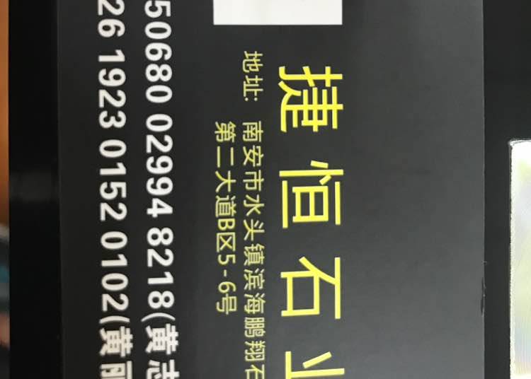 捷恒石材 聯(lián)系人:黃    139****8622 查看 手機(jī)號(hào)碼:無 主營范圍: 大板批發(fā)、 企業(yè)地址:福建南安水頭鎮(zhèn)鵬翔石材城第二大道B5-6區(qū)