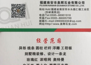 泉輝石業(yè)主營(yíng)產(chǎn)品:玫瑰紅,深啡網(wǎng),奧特曼,白玉蘭,雅士白,葡萄牙米黃,德國(guó)米黃,歐洲米黃,水晶莎安娜,水晶玫瑰,湖北黃金麻(荔枝面),英國(guó)棕,印度紅棕,印度紅(新礦),G636,芭拉白企業(yè)地址:福建南安水頭鎮(zhèn)仁福工業(yè)區(qū)(東嶺高鐵邊)